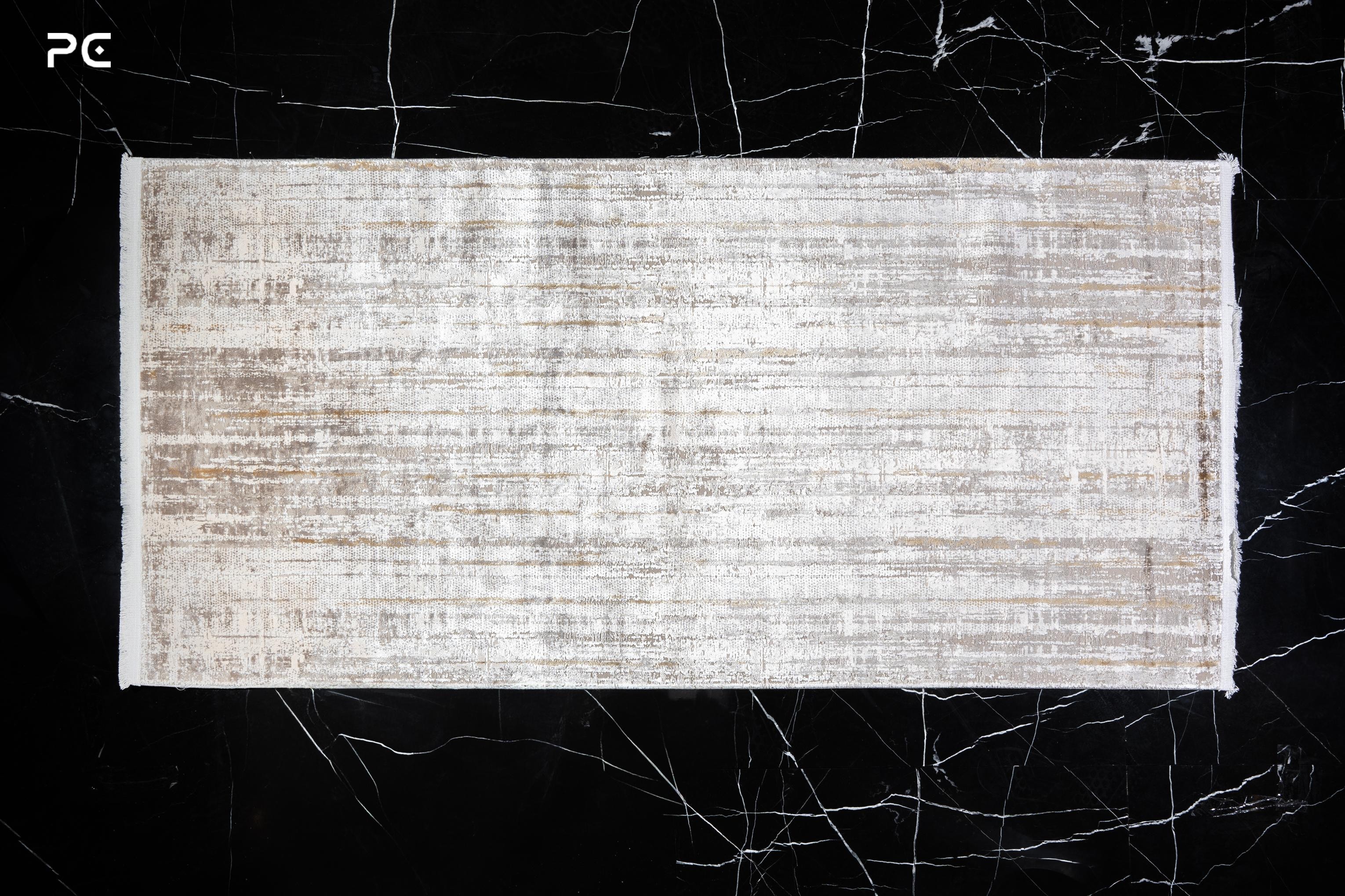 Runner rug with a background of beige tones with brown and gold.